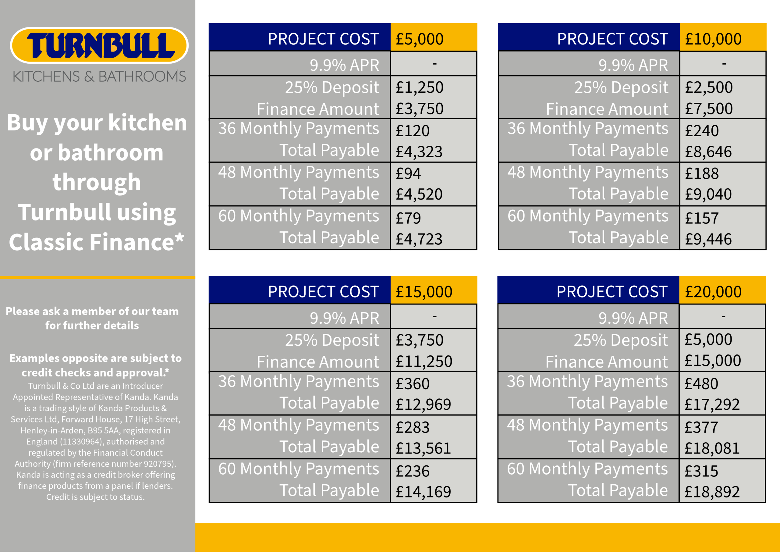 TURNBULL AND COMPANY LIMITED is an Introducer Appointed Representative of Kanda. Kanda is a trading style of Kanda Products & Services Ltd, Forward House, 17 High Street, Henley-in-Arden, B95 5AA, registered in England (11330964), authorised and regulated by the Financial Conduct Authority (firm reference number 920795). Kanda is acting as a credit broker offering finance products from a panel of lenders Credit is subject to status.